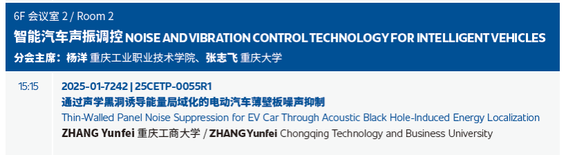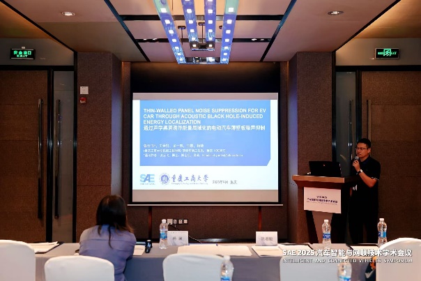 张云飞博士在“智能汽车声振调控”论坛上作了主题为“Thin-Walled Panel Noise Suppression for EV Car Through Acoustic Black Hole-Induced Energy Localization(通过声学黑洞诱导能量局域化的电动汽车薄壁板噪声抑制)”的报告。报告聚焦电动汽车噪声控制核心技术,展现了公司在智能车辆工程领域的研究实力与创新成果,赢得了参会者的广泛关注。借此大会搭建的高端交流平台,张云飞博士同步向现场专家学者介绍了太阳成集团tyc234cc主页智能车辆工程专业的历史沿革、学科定位、团队情况与特色优势,进一步扩大了专业的行业影响力。此外,张博士还与参会嘉宾就报告中的技术细节、应用场景及未来研究方向展开深入探讨,为后续学术合作埋下伏笔。