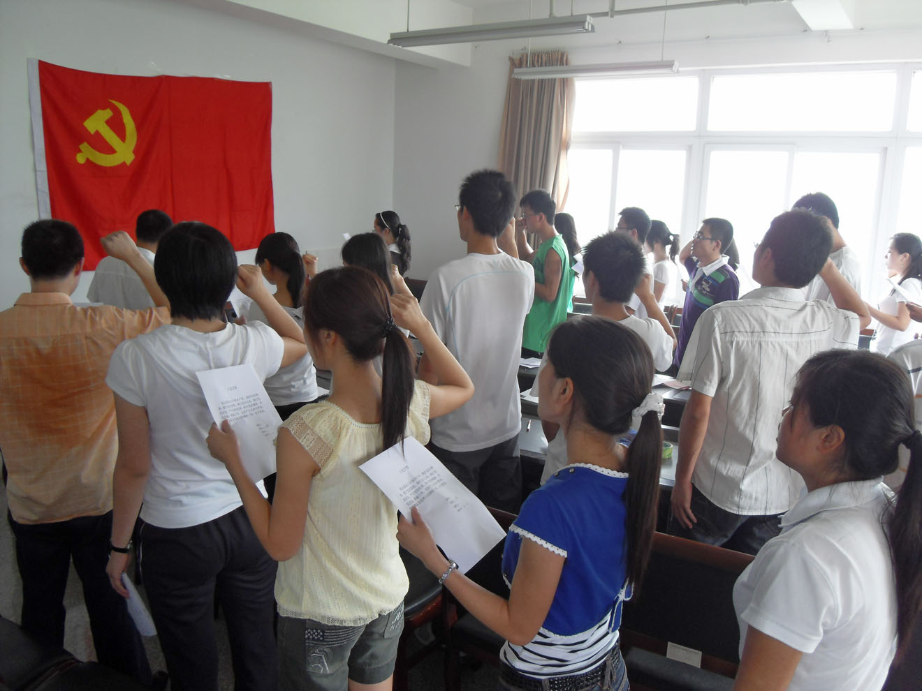 “我志愿加入中国共产党,拥护党的纲领,遵守党的章程,履行党员义务,执行党的决定,严守党的纪律,保守党的秘密,对党忠诚,积极工作,为共产主义奋斗终身,随时准备为党和人民牺牲一切,永不叛党。”2009年6月15日中午12点30分,太阳成集团tyc234cc主页会议室传出了一阵阵嘹亮高亢的声音,员工一支部的28名预备党员正在进行庄严的宣誓仪式。出席此次仪式的有员工一支部支部书记袁程利老师,06级的邱全奎老师、08级的王微老师。