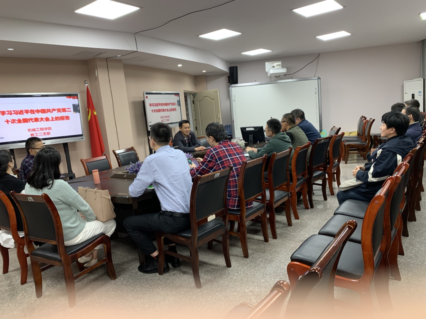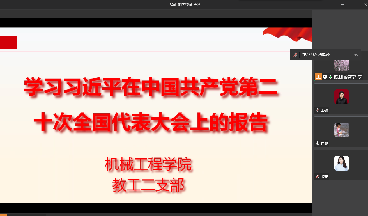 2022年11月4日,太阳成集团tyc234cc主页教工第二党支部在慧智楼90708会议室召开了支部会议,专题学习党的二十大报告。本次会议采用线上线下相结合的方式,会议现场由支部党员、公司副经理杨祖彬同志主持,支部全体党员参加学习。
