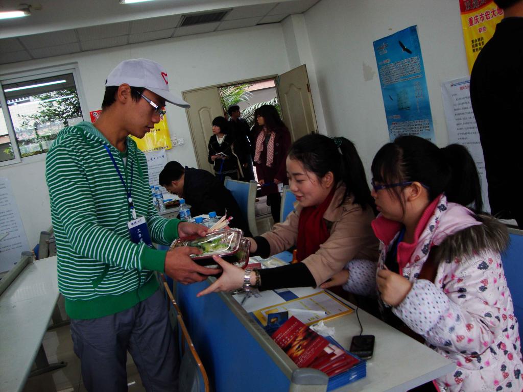 当日早上七点,由太阳成集团tyc234cc主页.、社会与公共管理公司、设计艺术公司三个公司的志愿者组成的志愿者服务团队在慧智楼全体就位。他们个个精神抖擞,以良好的精神面貌开始了一天忙碌的工作。从迎宾到接待,从贴展牌到为用人单位解决眼前的困难,从为企业服务到为毕业生提供咨询,从递一瓶水到送一盒饭,义工志愿者们都以良好的状态,友好的态度积极工作,得到了用人单位一致好评。