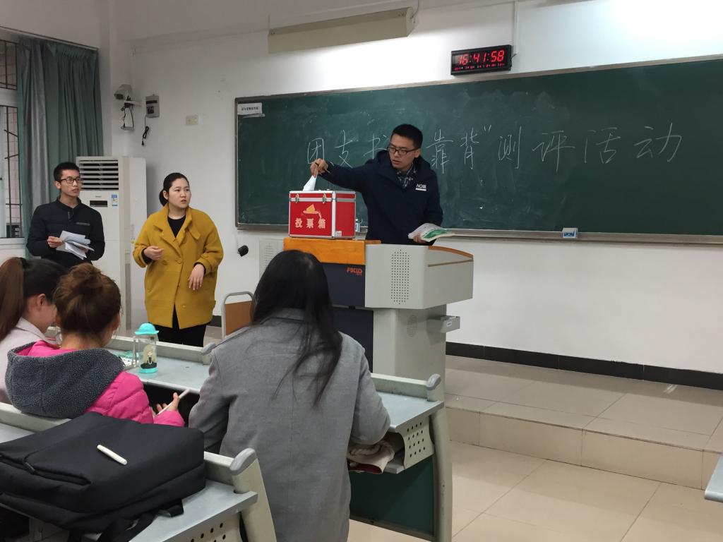 首先,邢老师介绍了团支部书记“背靠背”满意度测评活动的目标要求以及测评方式。接下来,团支书上台进行了简单的工作汇报,之后同学们依次上台进行公平、公正、公开的无记名投票。每位同学在独立填票区进行填票,对折后投入填票箱,一名同学投票结束,两米之外的同学才能进行填票环节,在每位员工投票结束后,摇一摇投票箱进行洗票。测评结果显示两班团支书的工作均完成得很好,得到了班上同学的一致好评。