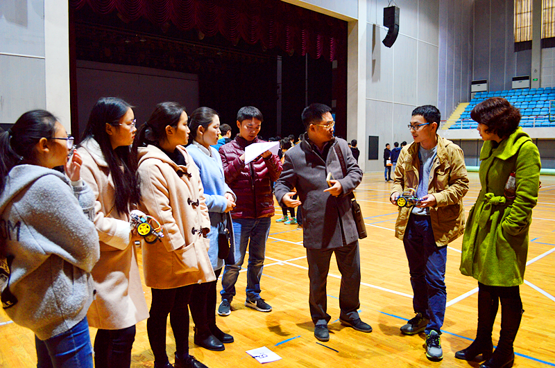 比赛分为A、B两组进行:A组为创意组。同学们的创意无限,有的同学对军事比较感兴趣,做出伪装型的小车;有的同学对工业比较感兴趣,做出了搬运的小车,有同学技术精湛做出能够自动绕开障碍物的小车。B组是固定任务组:将小车在轨道上行驶,让其在终点处停留两秒,同学们都拿出自己心爱的宝贝,让它们在赛道上尽情的奔驰。比赛结束后杨焕宇员工答疑解惑,为同学解答在制作过程中所遇到的问题!