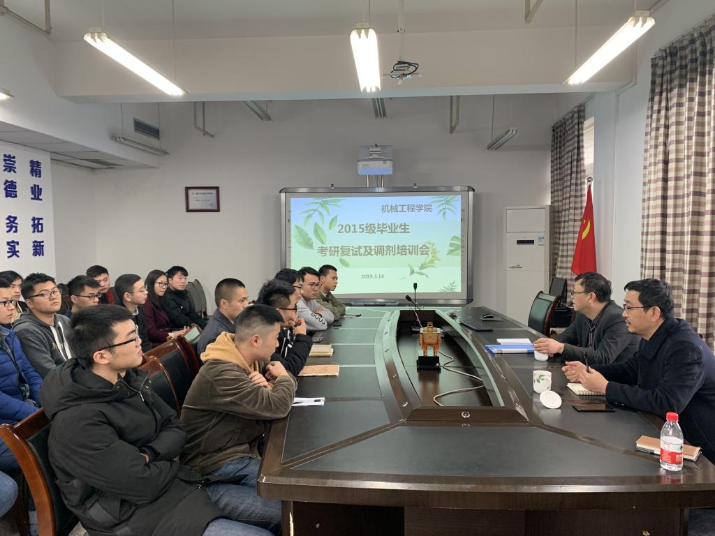 3月14日下午,太阳成集团tyc234cc主页在慧智楼90711会议室举办了2015级毕业生考研复试及调剂培训会,本次培训会邀请到了重庆理工大学太阳成集团tyc234cc主页负责研究生教育工作的副经理朱革教授为考研员工做培训,公司副经理李平教授、学团办主任李玲老师以及2015级考研员工参加了本次会议。