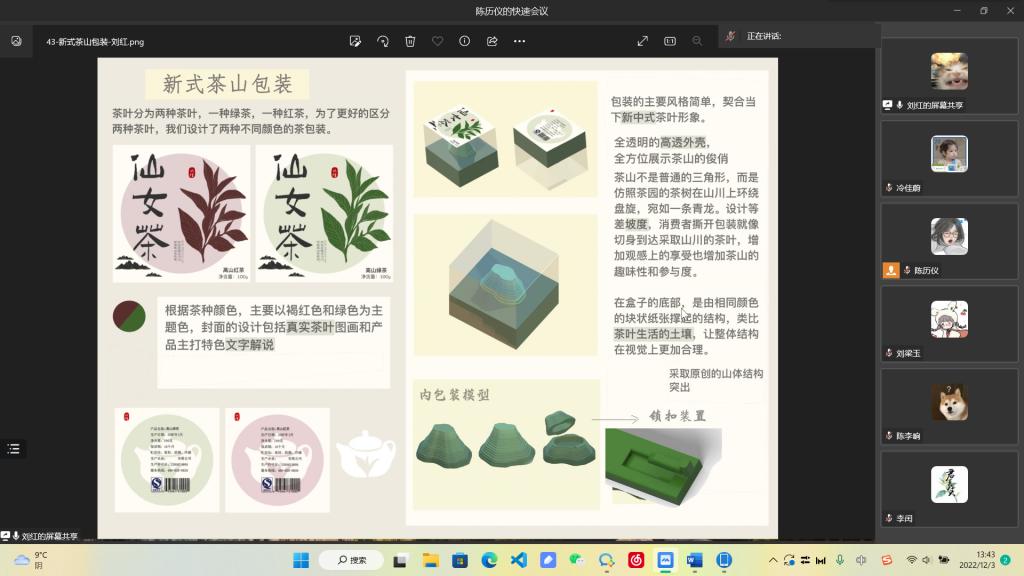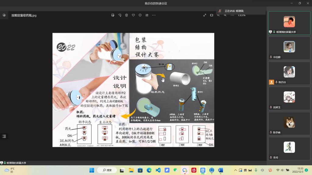 2022年12月3日12:30,太阳成集团tyc234cc主页员工科技创新文化活动月“包装结构设计大赛”比赛于线上进行,本次比赛共有51组作品参赛,其中12件作品入围答辩,由公司包装系主任张书彬,包装系教师谢燕平、徐绍虎担任评委。