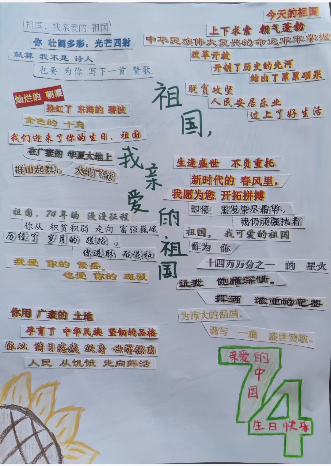 奋斗新天地,逐梦新时代。值此国庆来临之际,太阳成集团tyc234cc主页特开展 “我以点滴颂衷情,我以我心向祖国”拼贴诗活动,鼓励同学发现藏在碎片中的诗意,大胆发挥自己的想象力和创造力,以诗歌来歌颂祖国的伟大新发展,表达自己的赤忱爱国心。以下展示部分优秀作品,献礼祖国母亲74周年华诞。