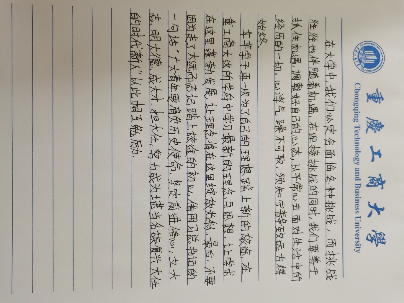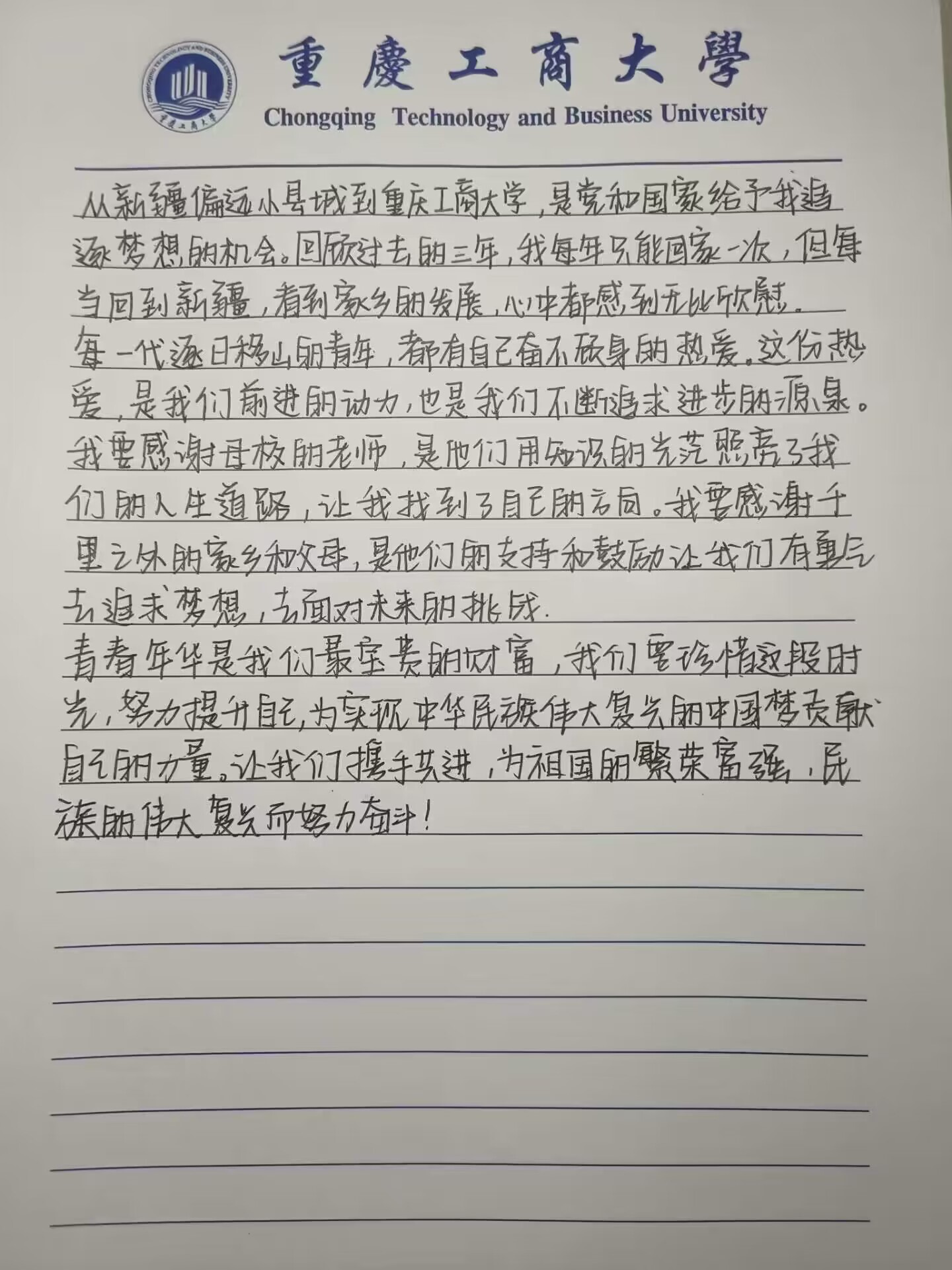 永葆奋斗精神,践行初心使命。奋斗是青春最亮丽的底色,行动是青年最有效的磨砺。2023级旅游管理五班的李春霖同学勇担历史重任,在艰苦奋斗中锤炼意志品质,奋发践行“请党放心、强国有我”的青春誓言,在实现中华民族伟大复兴中国梦的新征程上勇往直前。
