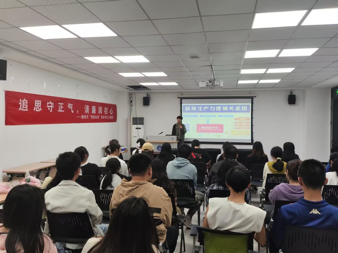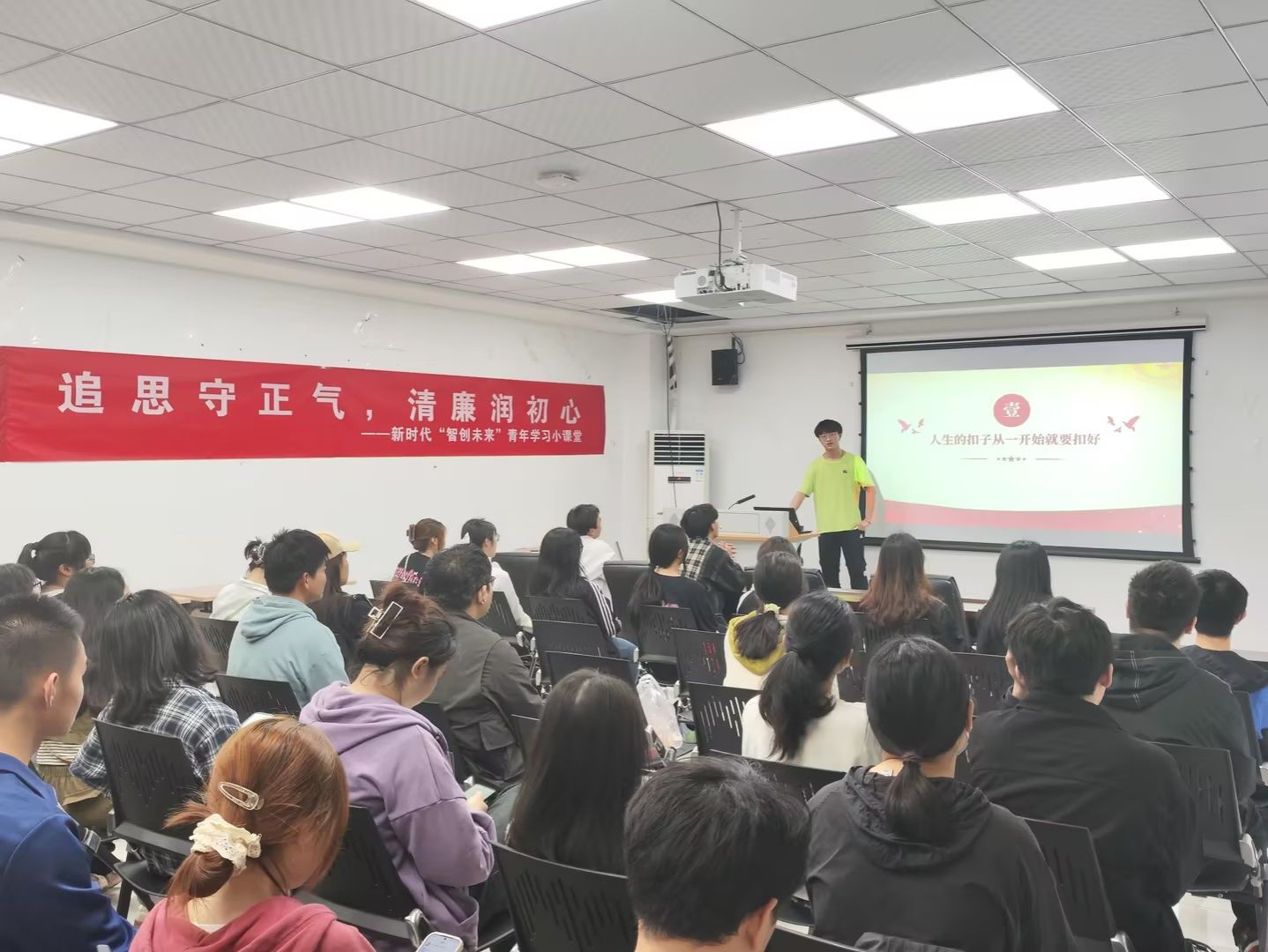 “青年者,人生之王,人生之春,人生之华也”。青年是国家的未来和民族的希望,清廉不仅是一种道德要求,更是一种精神力量。一个清廉的青年,要有正确的价值观,更要有坚定的信念和高尚的品质。主讲人胡红伟以清廉好青年“人生的扣子从一开始就要扣好”为题,面对大家,讲述了青年养成正确价值观的重要性,要用廉洁文化涵养时代新风。青年是国家的未来和民族的希望,我们要树立正确的世界观、人生观和价值观,为实现中国梦而努力奋斗。