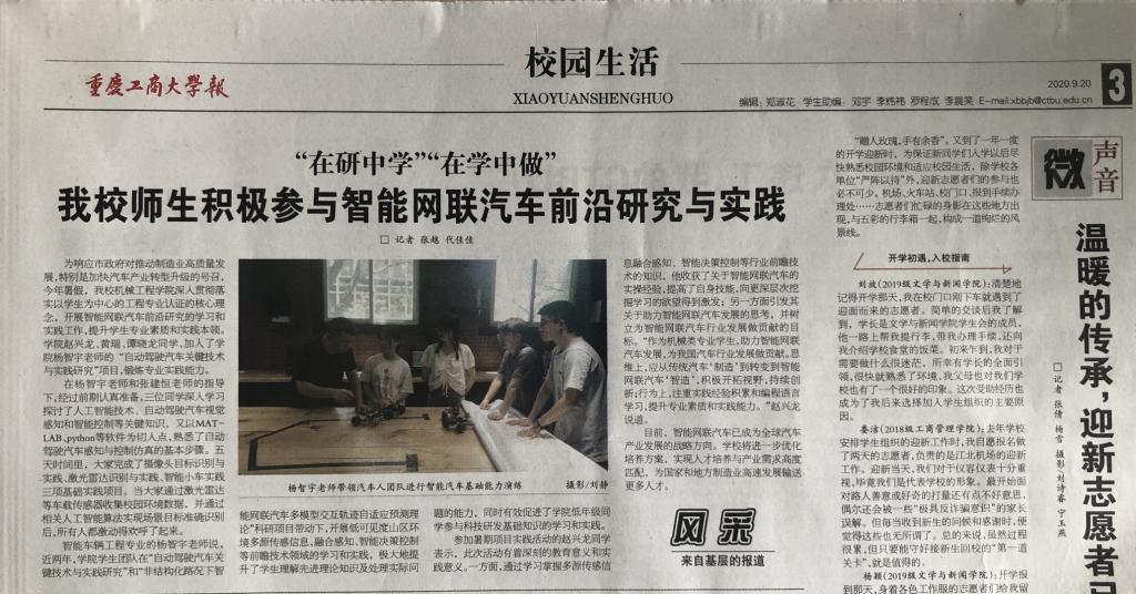 2020年暑期,公司社会实践团成员组队积极参与教师的前沿研究,引发媒体关注,继《重庆日报》全媒体平台报道后,近日,《太阳成集团tyc234cc主页报》以《“在研中学”“在学中做”公司师生积极参与智能网联汽车前沿研究与实践》为题对此进行了深度报道。