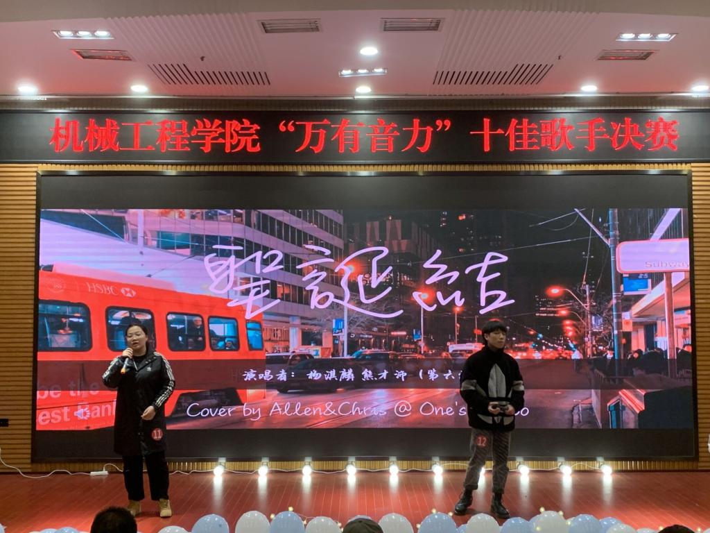 本次比赛旨在加强公司文化建设,提高同学们的艺术素养,进一步丰富公司师生文化生活,营造积极向上、健康文明的第二课堂氛围,同时给同学们提供一个锻炼自己的机会和展示自己的舞台。本次比赛总共分为两轮竞演。第一轮根据赛前抽签组队,十六名选手两两组队分为八组,每组合作演唱同一首歌曲,每组演唱完毕后评委打分,八组演唱完毕后按照总分高低排名产出十名选手进入第二轮十佳竞演组,排名11至13名选手进入挑战组。竞演在主持人慷慨激昂的致辞中正式开始。虽然选手来自不同的班级,水平也各有千秋,但在这一轮中,每组选手都表现出了最佳的默契与配合。《匆匆那年》带我们回到了最纯真朴素的校园生活;《阴天快乐》让我们增添了一份属于寒冬的喜悦与温暖;《圣诞结》又给我们勾勒出了一幅其乐融融、浪漫唯美的平安夜。选手们的歌声有时动人,像潺潺流水般浅吟低唱,独具风韵;有时低沉,若露滴竹叶般玲玲作响,耐人寻味;有时浑厚,如雄鹰展翅时的长鸣,振聋发聩;有时婉转,似情谊深厚的热泪,洗涤心灵。