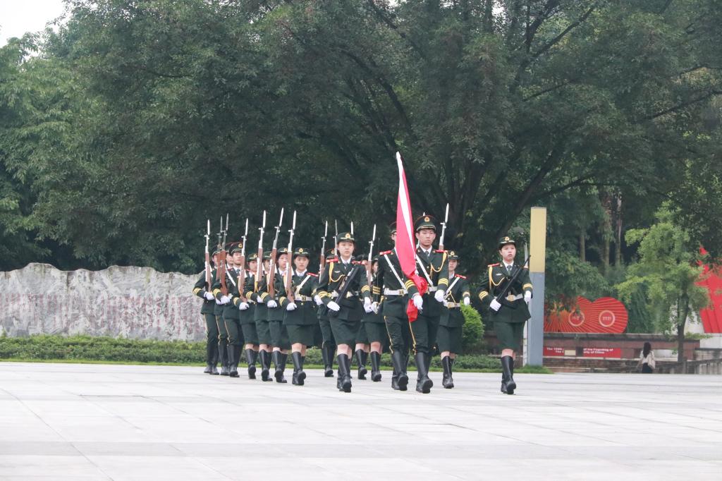 含弘广场庄严肃穆,国旗队踏出铿锵有力的步伐护卫五星红旗登上升旗台,雄壮激昂的《义勇军进行曲》响彻整个广场,鲜艳的五星红旗冉冉升起。