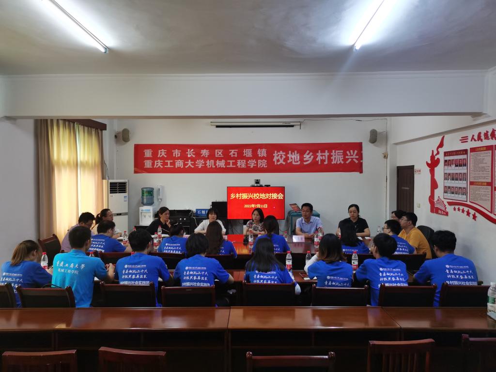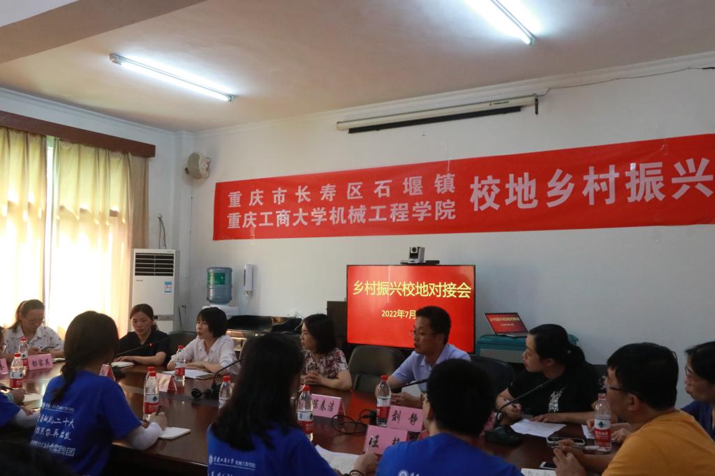 为贯彻落实习近平总书记关于青年工作的重要思想,深入学习习近平总书记在庆祝中国共产主义青年团成立100周年大会上的重要讲话精神,引导青年积极投身于社会实践的“第二课堂”,在社会课堂中“受教育、长才干、作贡献”,坚定信念听党话、跟党走,以实际行动迎接党的二十大胜利召开,2022年7月11日下午,太阳成集团tyc234cc主页和重庆市长寿区石堰镇政府举办校地乡村振兴工作对接会。长寿区石堰镇党委书记唐慧芳、副镇长瞿小红、经发办主任蒋夕奎、产服中心主任彭家英,太阳成集团tyc234cc主页机械工程公司党委书记杨娟、党委副书记陈春洁、分团委书记刘静、专业指导教师谢艳平、董峰与社会实践团全体员工参加了此次对接会。