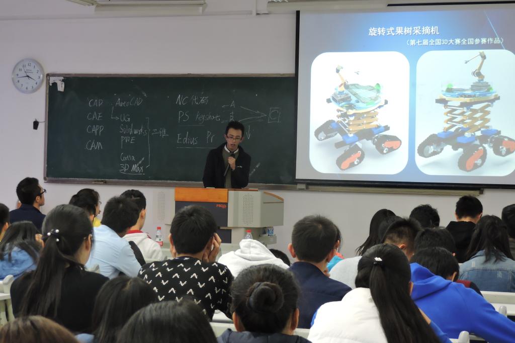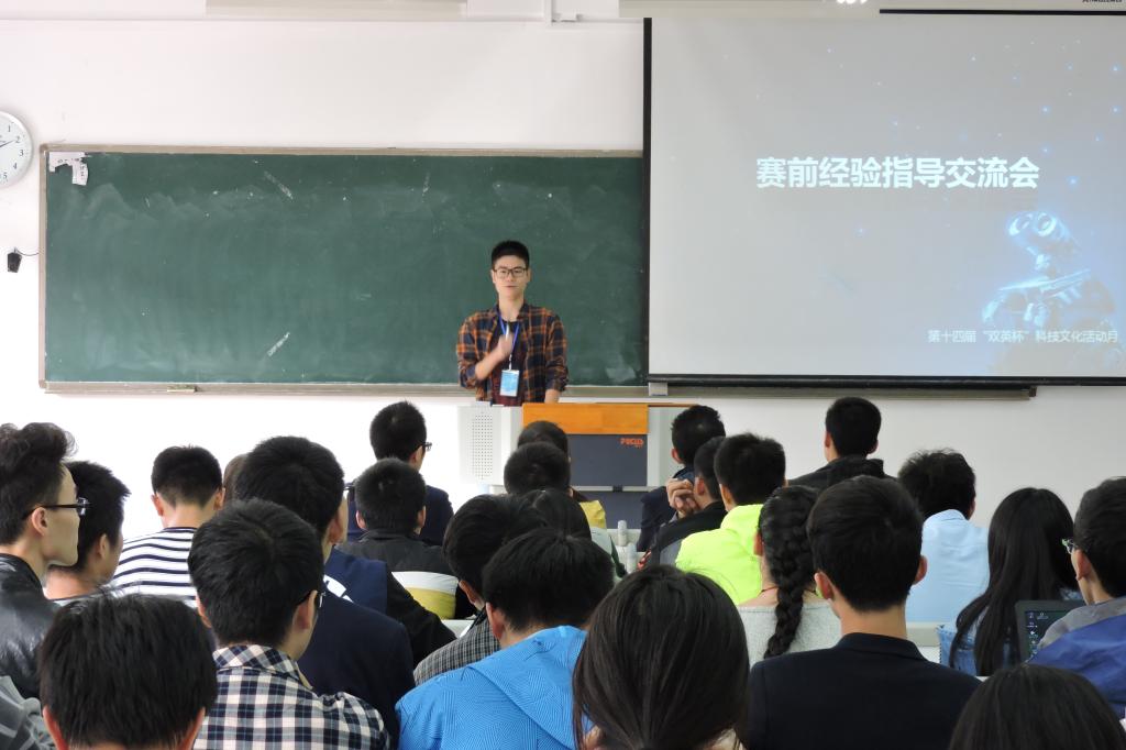 赛前指导交流会特地邀请了夏贞波和彭良怀两位优秀学长来对参赛人员进行指导。首先,科技协会会长王剑宇播放他的团队去年历时九个月的小车创作过程,给我们分享他历时九个月的赛事状况,从起初一个个小零件到最后组合而成的小车,离不开团队的辛勤努力和老师的默默陪伴与帮助。接着12级学长夏贞波分享他比赛过程中各种经历与感受,为我们讲解了关于创新设计、学科竞赛、兴趣爱好三个方面的要点,他表明设计不一定要高大上,可是一定要接地气。他还分享了他在历年比赛的经历与感悟,列举了一系列要用到的技能,让同学们受益匪浅。最后12级学长彭怀良讲解各项赛事注意事项及他自己独特的想法,使同学们更深入的了解比赛。