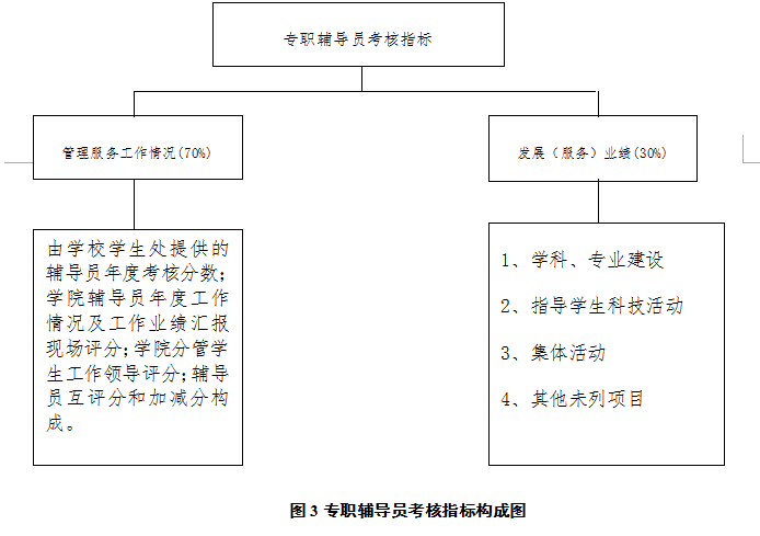 从管理服务工作情况和公司发展(服务)业绩两方面对辅导员完成的工作任务进行考核,考核的占比及主要指标见图4,以期全面、客观和真实地反映专职辅导员的年度业绩。
