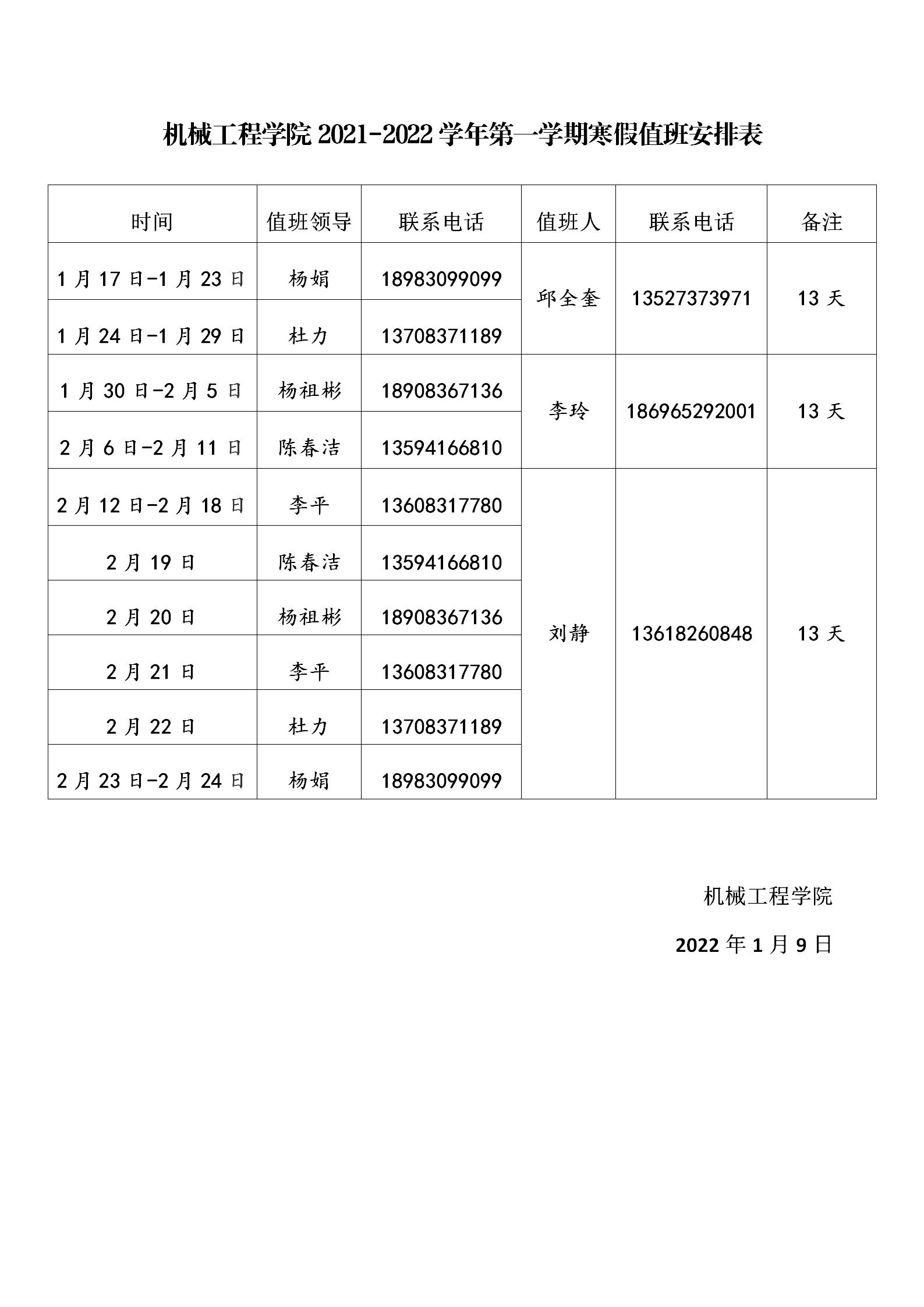 2021-2022学年第一学期寒假值班安排表