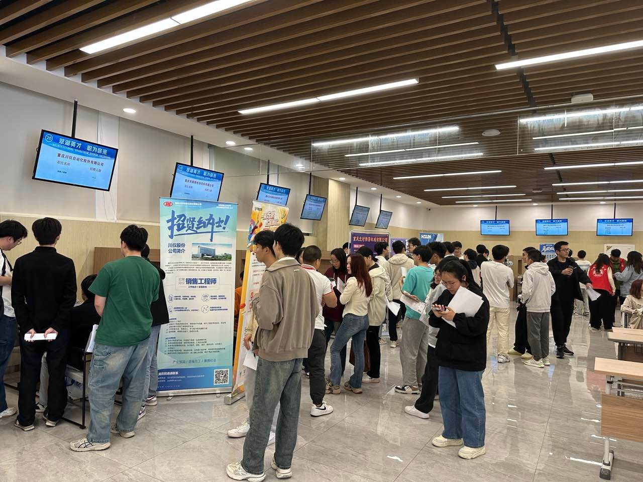 双选活动吸引到重庆川仪自动化股份有限公司、重庆宗申机车工业制造有限公司、东鹏饮料集团、赛力斯汽车(湖北)有限公司等26家企业,涉及制造、科技、管理、教育等多个行业类别,提供就业岗位1000余个,吸引全校近500名毕业生参加。
