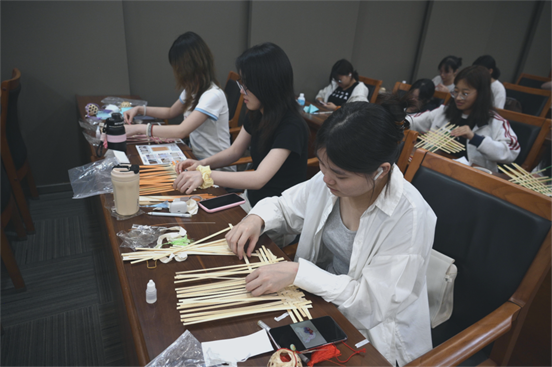 作为活动的核心环节,竹编制作在柔和灯光与舒缓音乐中展开。老师、同学们利用竹编材料包随心创作,专注于竹条的经纬编织。在重复而有节奏的编织过程中,焦虑情绪逐渐被平静取代,竹丝的温润触感与完成作品的成就感,共同构建了自然的心理调节机制。现场一件件独具匠心的竹编作品,不仅是传统文化的现代表达,更成为师生传递文化自信与心灵能量的载体。
