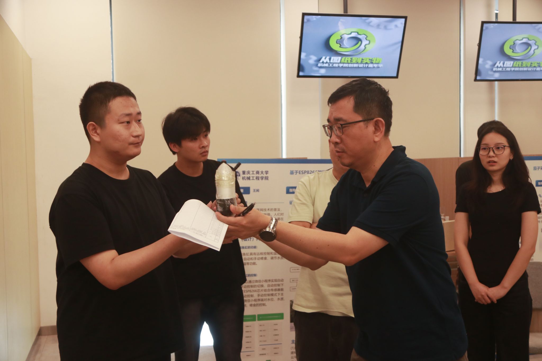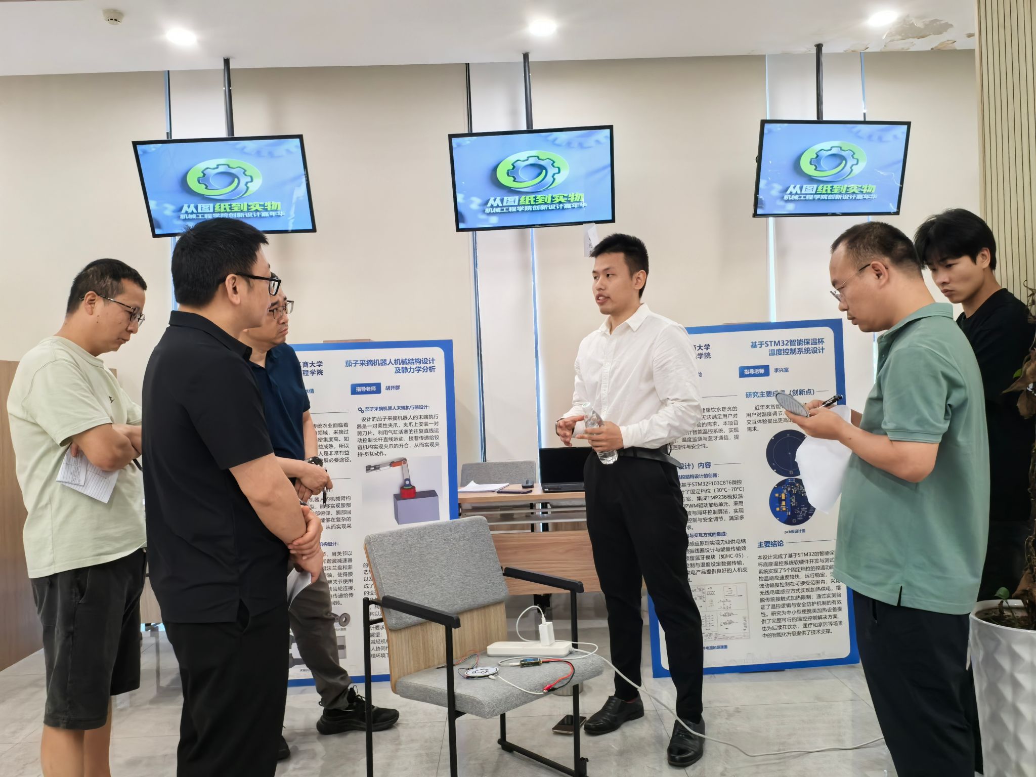 本次评审活动由9位专业老师组成评审团队,对所有参展毕业设计的研究背景、内容方法、结论成果以及主要创新点进行了深入了解,并展开针对性提问。同学们通过实物展示和视频演示等丰富形式,全方位呈现毕业设计成果,面对评委老师的提问,沉着应答,展现出扎实的专业素养。