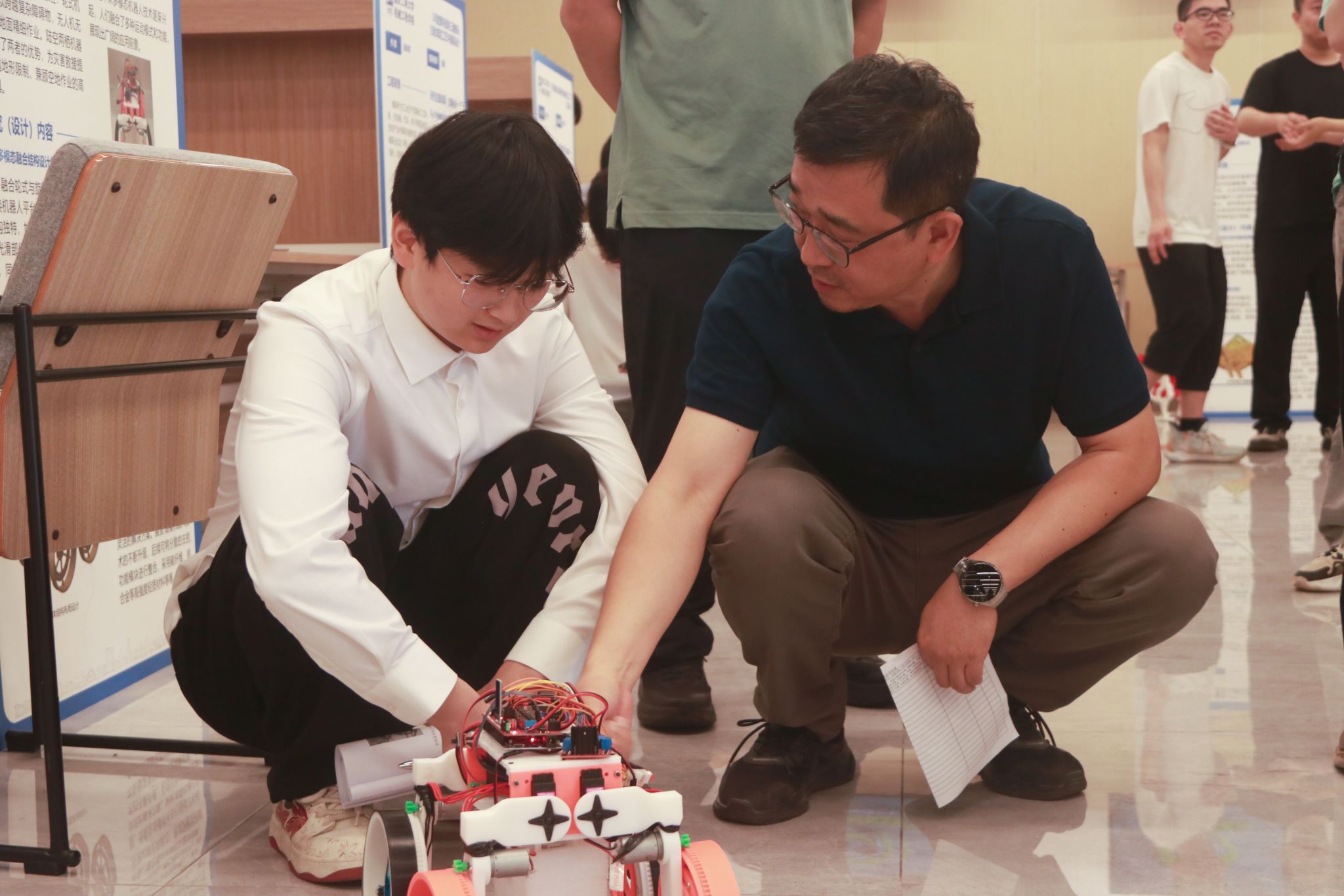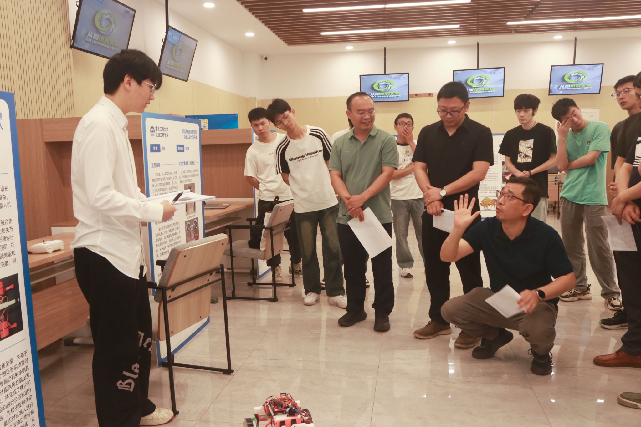 此次毕业设计展内容丰富,覆盖仿生机器人、智能物流、产品设计、多模态机器人等多个前沿技术领域。其中,智能物流搬运机器人运用先进的视觉识别技术,为物流行业智能化发展提供新路径;空陆两栖多模态移动机器人则为灾害救援场景提供了创新解决方案。这些作品生动诠释了“从图纸到实物”这一机械工程教育的核心理念,每一件参展作品均完整经历从概念设计到实物制作的全过程,不仅彰显了员工们深厚的理论功底,更体现出其卓越的动手实践能力。在评审环节,同学们不仅展示设计成品,还深入阐述设计思路与技术创新点,得到评审专家的高度认可,同时,专家们也针对作品现存不足提出宝贵建议,为同学们开拓了新思路。