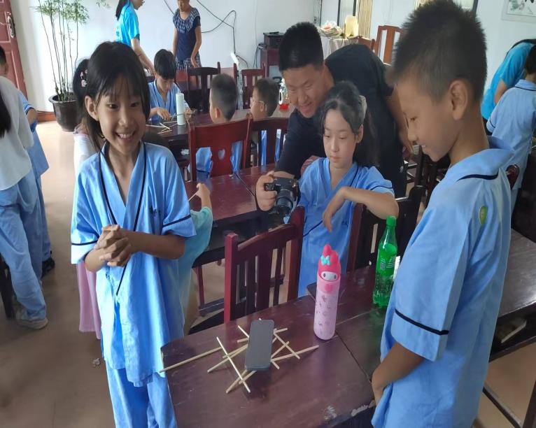 活动伊始,“筷子搭桥承重”课堂率先拉开帷幕。实践团成员先展示预先用筷子搭建好的桥梁模型,将数书本置于其上,模型依旧稳如泰山、纹丝不动。随后,孩子们也发挥自己的想象用筷子搭建桥梁。“三角形具有稳定性,可以把筷子交叉固定,这样会更加牢固。”“这边可以再加一根筷子。”现场讨论声延绵不断,大家都开动自己的脑筋提出自己的意见,并对自己小组的作品不断的进行优化调整改进。虽然有些小组并没有成功搭建好桥梁模型,但是他们并没有气馁,在课后仍刻苦训练,向别人请教。筷子搭桥不仅是教给青少年科学知识,更是教会他们在生活中要有敢于实践、不畏惧失败、善于向他人请教的精神品质。