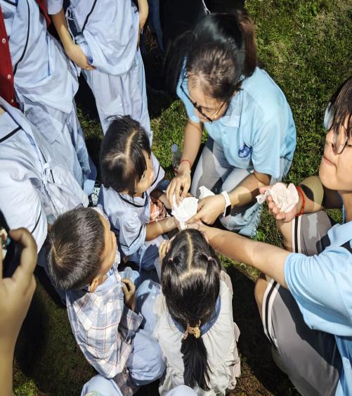 次日下午,同学们与乡村青少年一同前往郊外露营,在大自然的怀抱中开展了“自制碳酸饮料”实验课。营地的空地上,大家围坐成圈,实践团成员先结合露营场景讲解:“夏天露营时喝的碳酸饮料,那些清爽的气泡其实藏着科学秘密——柠檬酸与小苏打反应会产生二氧化碳气体,这就是气泡的来源。”随后,孩子们在指导下,用便携的容器依次添加材料、搅拌溶解。当最后一勺小苏打倒入瓶中,神奇的一幕在露营地发生了——液体瞬间“沸腾”,大大小小的气泡争先恐后地往上冒,伴着郊外的微风,气泡破裂的声音格外清脆。一名员工举着自己制作的饮料,兴奋地说:“在露营时亲手做出带气泡的饮料,太酷了!原来这就是科学的魔法!”