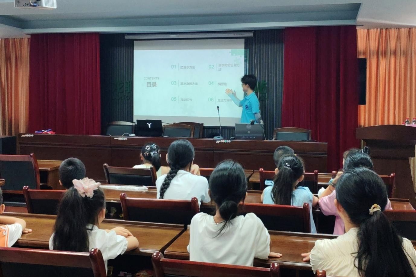 活动尾声,实践团为孩子们播放了精心准备的心肺复苏专业视频与防溺水科普短片,其中科普短片尤其受到孩子们的喜爱。短片中,“溺水案例警示” 与 “成功救援实录” 的对比呈现,给孩子们带来了强烈的视觉冲击。一位小朋友在观看后表示:“看到溺水的可怕后果,我以后一定会远离危险水域。” 这两部视频的播放,不仅丰富了孩子们的防溺水知识,更让 “预防为先” 的理念深入人心,切实提高了孩子们的安全防范意识。