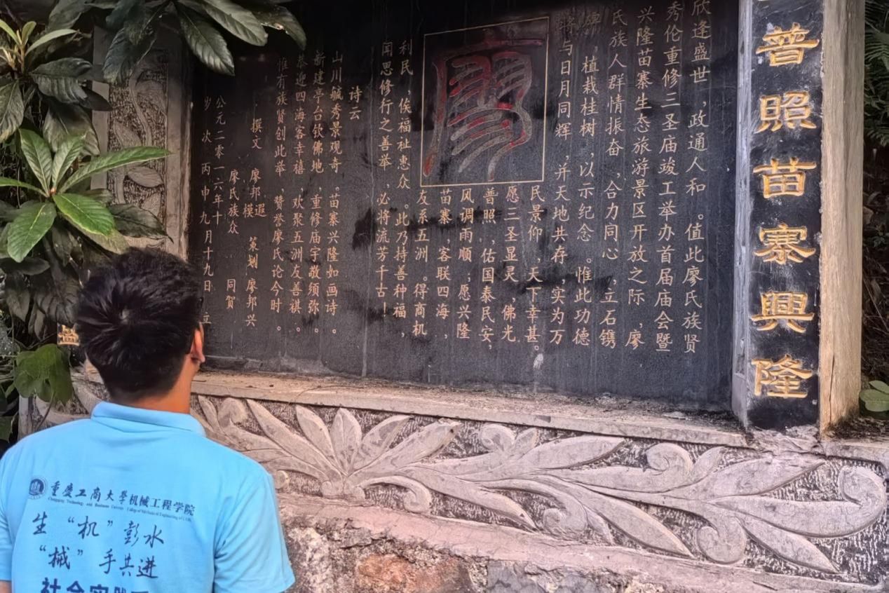 实践首日,团队聚焦“脚步丈量,倾听心声”,团队成员于兴隆苗寨外的民俗文化宣传浮雕上大致了解了苗族婚俗、杀年猪和上刀山等特色文化,同时也在文化宣传涂鸦墙上见识到吃刨汤、泉药和苗族服饰等特色。团队成员细致观察,以海纳百川之姿学习其他民族文化。