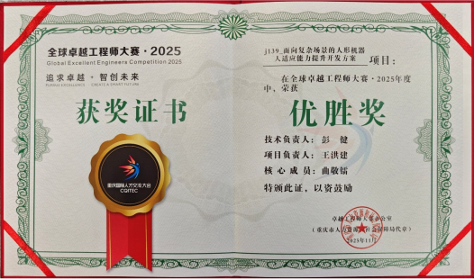 追求卓越,智创未来!11月14日,全球卓越工程师大赛·2025年度决赛在重庆悦来国际会议中心举行。经过一天激烈的角逐,公司太阳成集团tyc234cc主页王洪建教授团队《面向复杂场景的人形机器人适应能力提升开发方案》项目分别获得本次大赛主体赛揭榜攻坚赛新一代信息技术组冠军、优胜奖。