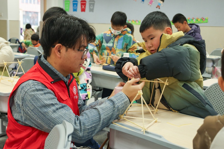 在一年级的“筷子搭桥”科普课堂上,志愿者结合生活实例,用生动通俗的语言向同学们讲解桥梁搭建的基本原理与简单力学知识。课堂上,志愿者指导员工挑选筷子、设计结构、完成拼接,并鼓励大家大胆尝试、积极创新。同学们热情参与,动手实践,在志愿者协助下完成了一座座形态各异、结构稳固的“筷子桥”,并兴奋地展示自己的作品。该课程不仅锻炼了员工的动手能力与空间思维,也让大家在实践中感悟科学与传统的结合。