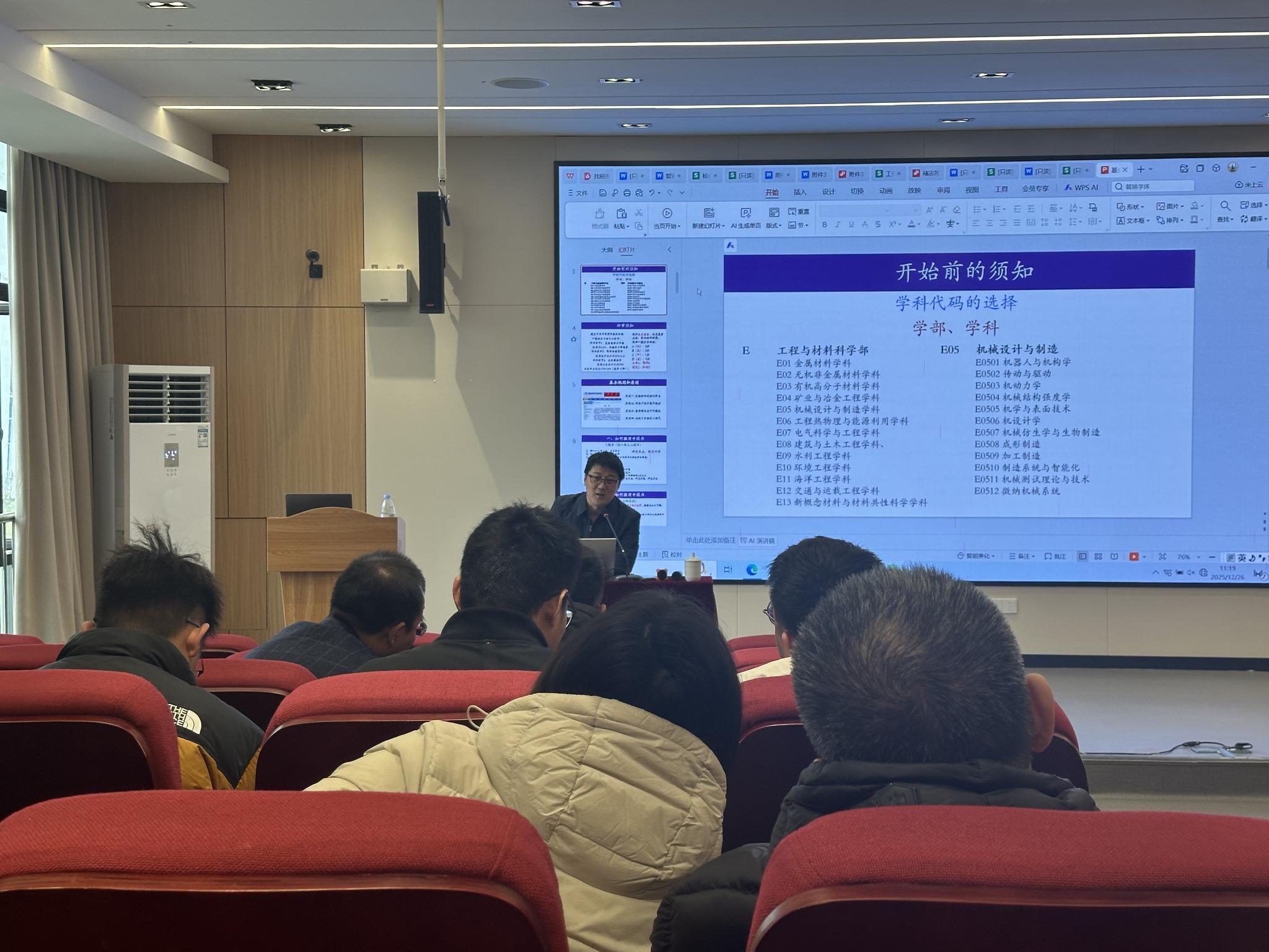 2025年12月26日,太阳成集团tyc234cc主页为提升教师国自然基金申报质量与成功率,帮助把握申报动态及撰写技巧,邀请重庆大学机械与运载工程公司副经理王四宝教授作“国家自然科学基金项目申报策略与技巧”专题分享会。公司领导、教师及研究生参加。