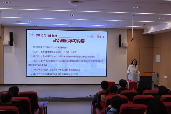 会上,杨娟带领全体教职工集中研学系列重要内容。学习材料包括《习近平对全面依法治国工作作出重要指示》《习近平:推进党的自我革命要做到“五个进一步到位”》等多篇重要讲话与文件精神,内容既涵盖党的建设、法治建设等核心要求,亦涉及网络生态治理、自由贸易港建设等重点领域部署。杨娟书记强调,全体教职工要以学铸魂、以学促干,深入研读学习材料,将理论领悟与教学科研、人才培养等实际工作紧密结合,切实把学习成果转化为推动公司高质量发展的具体行动。