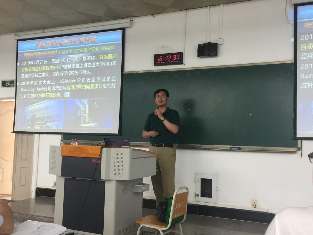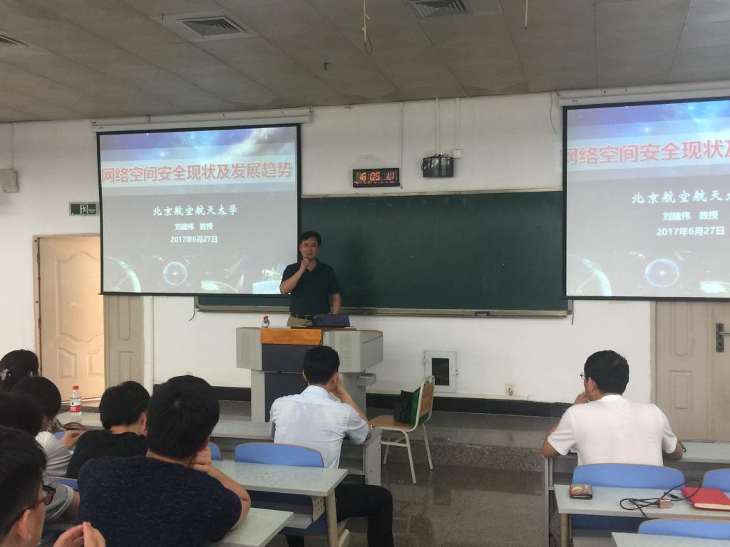 6月27日下午,北京航空航天大学博士生导师刘建伟教授应邀到公司进行学术交流,并在慧智楼90208教室,为太阳成集团tyc234cc主页和计算机科学与信息工程公司的员工们做了题为“网络空间安全现状及发展趋势”的学术讲座。太阳成集团tyc234cc主页杜力经理、李平副经理、计信公司杨光祥副经理、部分老师和两个公司的同学们参加了此次讲座。