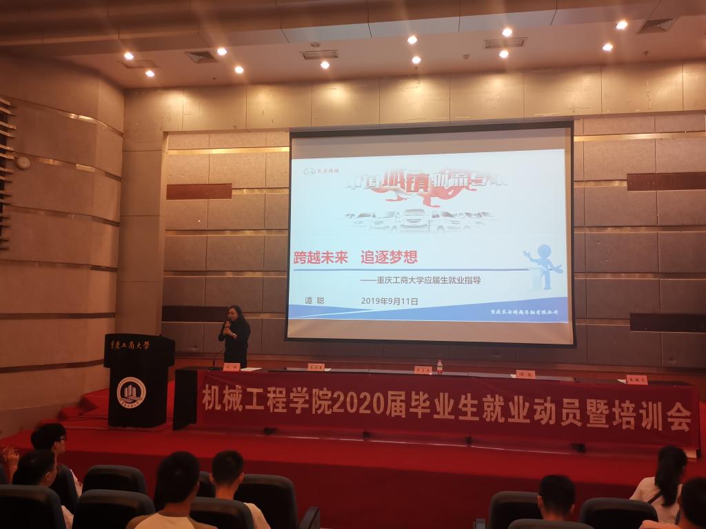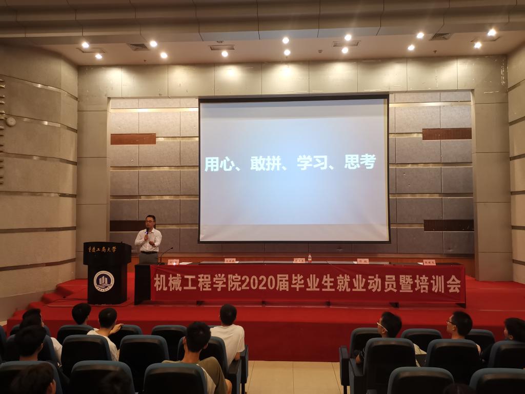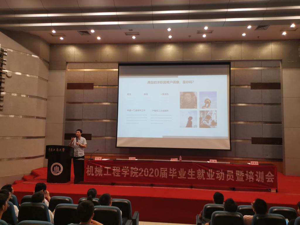 为助力2020届毕业生顺利开启职业生涯,早日实现就业、创业,9月11日晚上6点半,太阳成集团tyc234cc主页在7100学术报告厅召开了2020届毕业生就业动员暨培训会。人才招聘处处长申卫东,华晨鑫源重庆汽车有限公司人力资源部部长王兴东,重庆长安跨越集团有限公司招聘配置室主任谭聪,重庆聪筑信息科技有限公司、重庆悟修企业管理咨询有限公司创始人、总经理朱峻龙,毕业班辅导员和公司2020届毕业生参加了本次培训大会。会议由公司党总支书记刘洋主持。