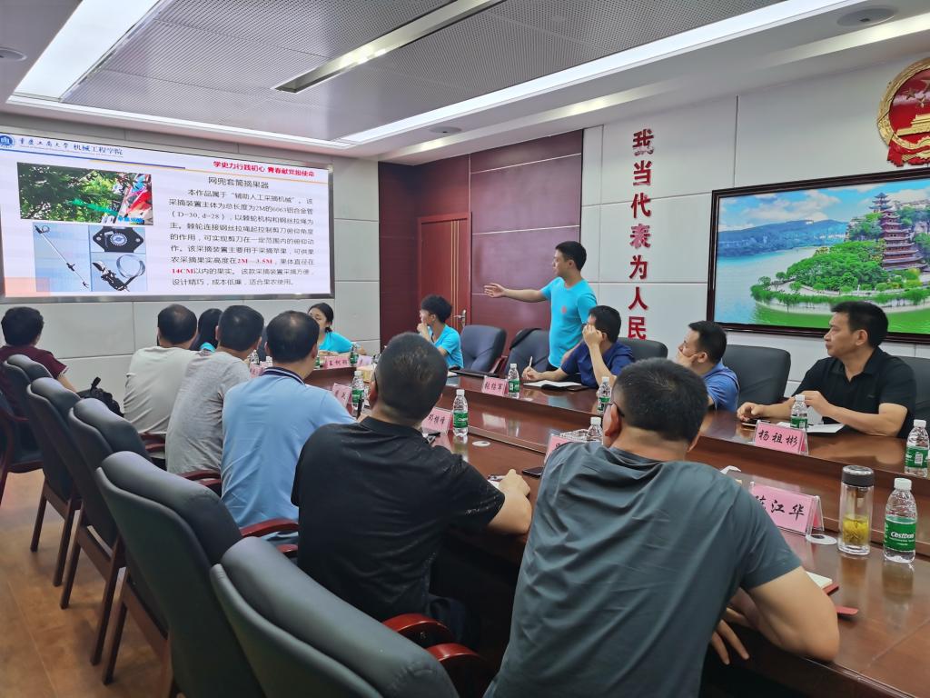 针对座谈会中,当地种植户和企业主反映的在产业升级中面临发展瓶颈和技术问题。实践团冒雨驱车300多公里,进行了实地考察,为新政村柑橘采摘机械化应用、玉印山牌忠州豆腐乳厂包装改良、凉水村皇凤脆桃园幼果套袋提速、重庆市奇罗特饲料有限公司物料科学堆码、秦岭村忠县四通农业开发有限公司珍稀白茶包装设计提档升级、八月瓜产品如何优化物流运输减少损果、蜂糖脆李如何保鲜和差异化选果销售等问题,或进行现场实验或出谋划策或提供合理化建议或研讨改良方案。在社会实践总结会上,研究生团队代表何国华展示了基于前期设计的机械采摘器改进方案,本科生星包装团队代表陈美展示了当地特产忠橙包装设计理念和方案,博士们对八家调研单位的问题进一步提出初步解决方案。实践团的渊博学识,务实态度得到了与会领导和企业家的充分肯定。
