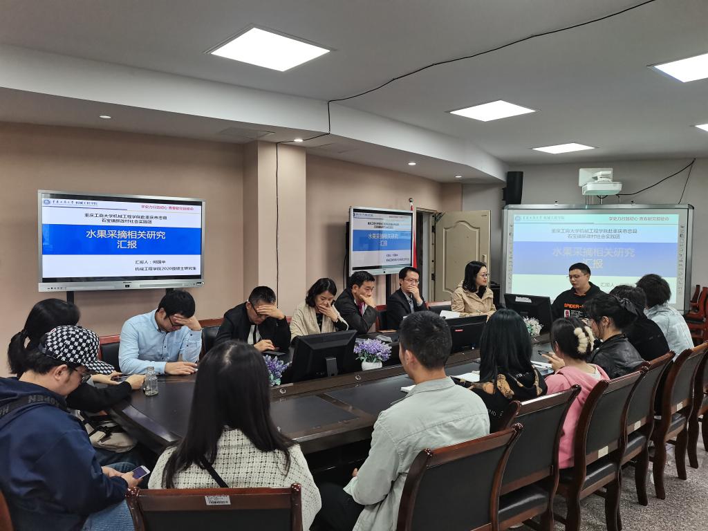 乡村振兴实践团代表何国华同学汇报了对忠县水果采摘的相关研究。在本次活动中,实践团的同学在博士老师的帮助下利用所学的知识与技能设计了很多成本低廉且实用性强的水果采摘装备,并与部分村民进行了沟通与交流,提高了农户采摘水果的效率。同时,他就目前投入使用的设备总结出不足之处:对果实的损伤率较高、采摘环境非结构困难等,并提出了相关改进和思考与同学们讨论。