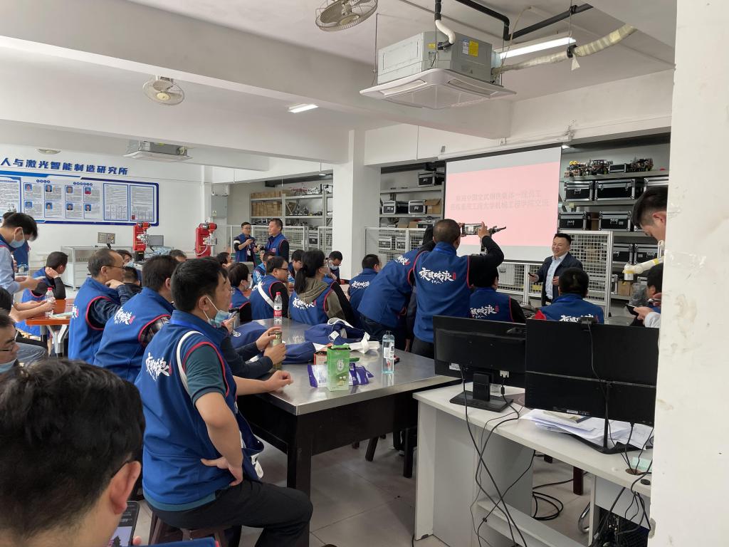 之后研究所师生给中国宝武集团一线员工展示了激光清洗、激光切割等加工工艺,以及机器人的操作和日常维护过程。经过系统的培训过后,中国宝武集团一线员工对研究所设备进行实际操作。实际操作过程中学习氛围浓厚,就机器人基本结构、控制、编程等话题进行了现场讨论。