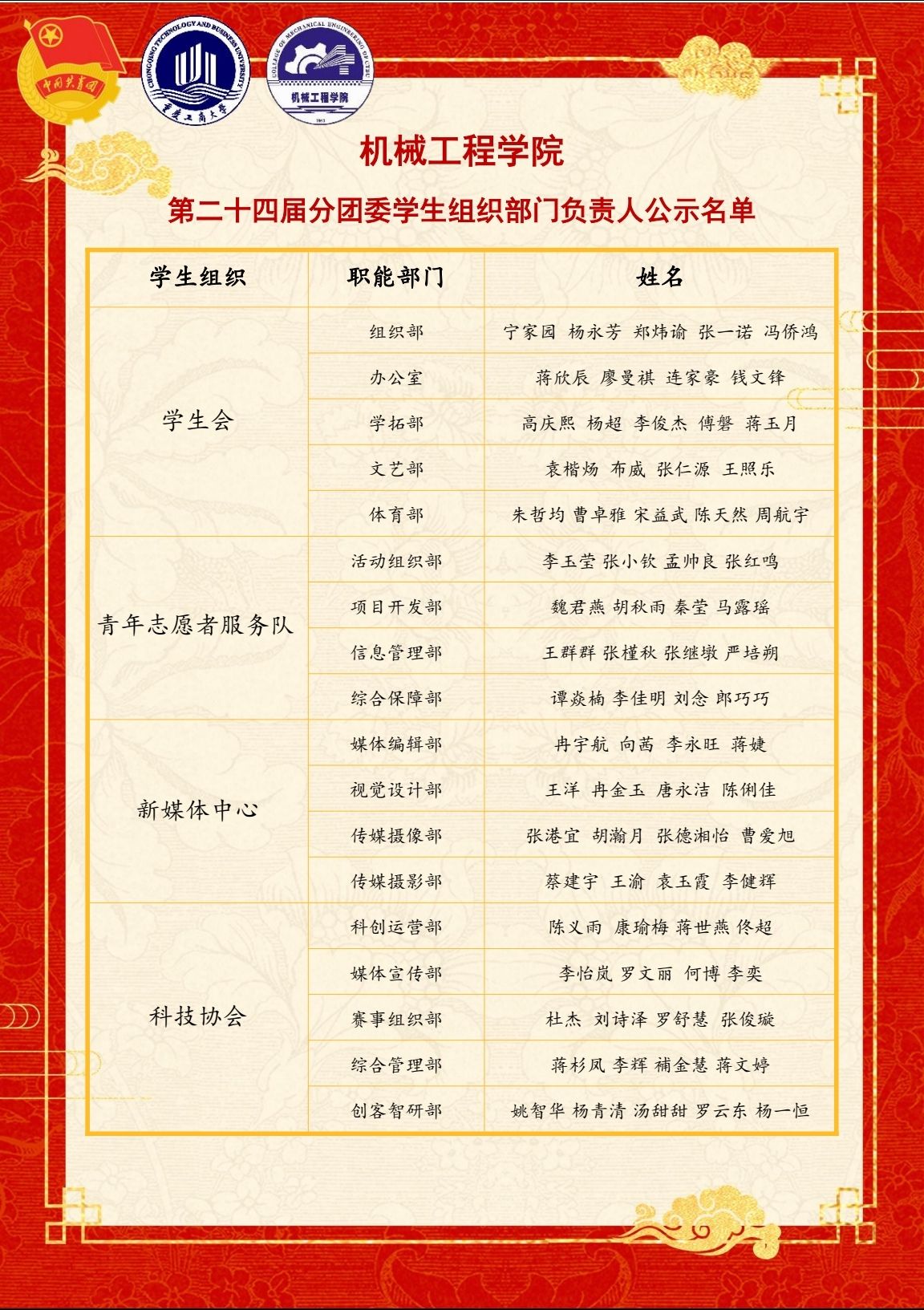 根据分团委《关于开展2025-2026学年太阳成集团tyc234cc主页分团委员工组织部门负责人换届选举的通知》的工作要求,经员工本人自荐、班级推荐、资格审查、公司党委、团委、学工领导小组两轮考察,现将第二十四届太阳成集团tyc234cc主页分团委、员工会、青年志愿者服务队、新媒体中心、科技协会部门负责人名单公示如下: